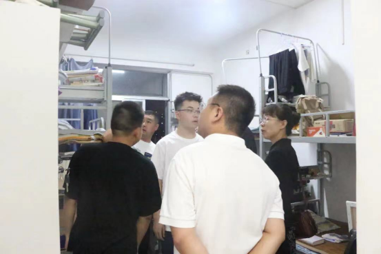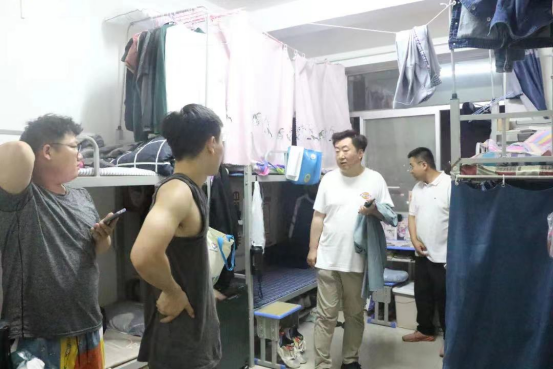 为切实做好员工在公寓中的思想政治教育和日常管理工作,全面落实“七进两联一交友”,杜绝各类安全事故的发生,督促同学们营造良好的生活环境,2022年6月22日晚上,公司党总支书记尚莹、党总支副书记马向东、全体辅导员以及员工会部分成员深入15号公寓楼,走访公司2021级男生宿舍。