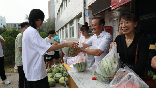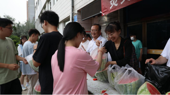 脆甜可口的西瓜堆放在3号楼前,在公司领导、辅导员老师的组织下,同学们以宿舍为单位井然有序地排队领取消暑物品。活动现场气氛轻松愉快,老师和员工的脸上都洋溢着欢快的笑容,在欢乐的气氛中,消暑物品发放工作有条不紊地开展。